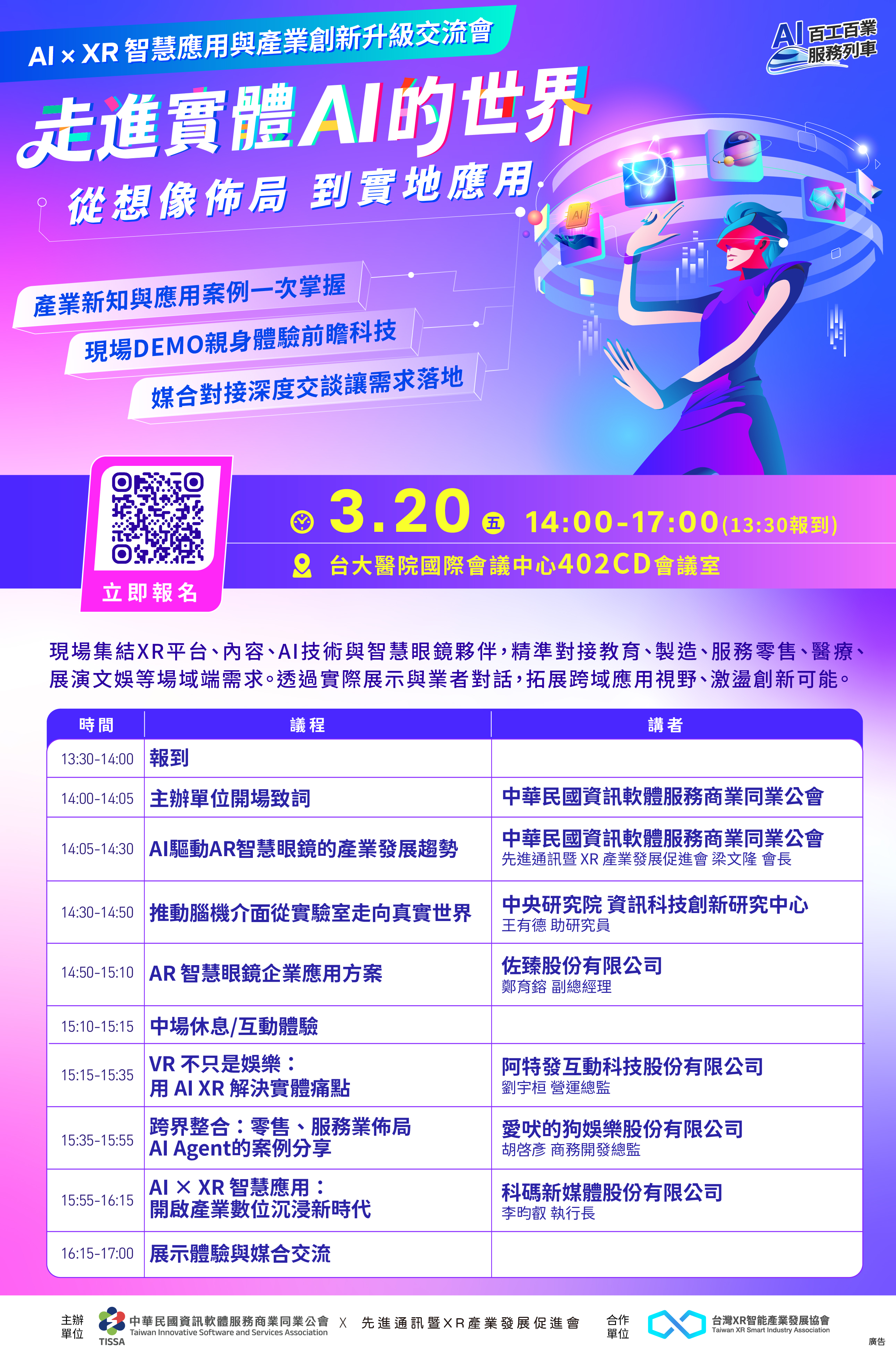 一、為推廣AI與XR技術之落地應用,協助各產業推動數位轉型,中華民國資訊軟體服務商業同業公會先進通訊暨XR產業發展促進會辦理旨揭活動。活動將聚焦AI驅動XR領域之產業發展趨勢,並分享智慧教育與企業實務應用案例;現場亦邀集AI與XR技術夥伴進行實體展示體驗及交流媒合,期促進跨域合作與應用發展。